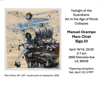 Twilight of the Guardians: Art in the Age of Moral Collapse reúne o trabalho de três artistas que utilizam a pintura, o desenho e a provocação gráfica para criar paisagens e retratos oportunos de uma ordem global em vertigem.